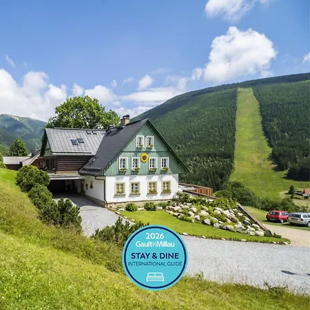 يقع Pension Slunecnice & Panorama Restaurant Farma Špindlerŭv Mlýn ذو 3 نجوم على بعد 18 دقيقة سيرا على الأقدام عن هورال ويوفّر خدمة الواي فاي في الأماكن العامة و موقف السيارات. بيت الضيافة يقع في الجبال والوادي وعلى بعد 1.9 كم من ملاهي شبيندليروف ملين المائية.